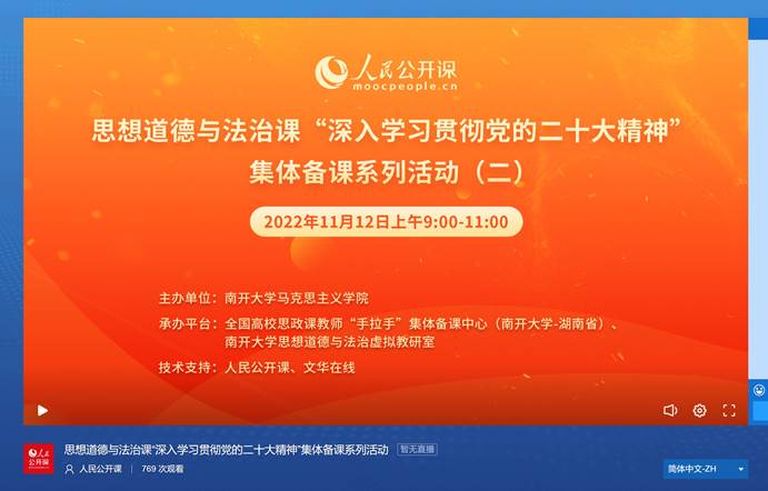 为深入学习贯彻党的二十大精神,推动党的创新理论最新成果融入高校“思想道德与法治课”的教学内容,2022年11月12日上午,yl8858永利集团思想道德与法治教研室全体教师在线参加了由南开大学yl8858永利集团主办、全国高校思政课教师“手拉手”集体备课中心南开大学思想道德与法治虚拟教研室承办的思想道德与法治课“深入学习贯彻党的二十大精神”集体备课会。会议分为两个主题,主题一由西南政法大学yl8858永利集团林峰副教授讲授“爱国主义的科学内涵及时代要求”,主题二由南开大学yl8858永利集团李星博士讲授“网络并非德外之地”。专家分别从这两个主题出发,将党的二十大精神融入思想道德与法治课程的教学内容中,并结合自己讲授思想道德与法治课程的教学工作分享了自己的教学经验。听完两位专家的主题交流之后,yl8858永利集团思想道德与法治教研室全体教师围绕思想道德与法治课专题教学、资源共享以及党的二十大精神融入课程教学设计等方面在线展开研讨和交流。