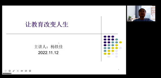 为全面落实师院党委“21122”总体工作思路,进一步提高师范生培养质量,助力师院内涵式高质量发展和唐山市基础教育事业高质量发展,2022年11月12日晚,yl8858永利集团通过腾讯会议举办“名师讲堂”活动。此次讲座的主题为:“让教育改变人生”,邀请了石家庄市第二十八中学教务主任、优秀班主任杨轶佳老师主讲,活动由yl8858永利集团教师胡志洋主持。
