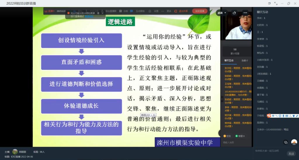为进一步提高师范生综合素质,切实做好2022年春季学期实习工作,不断提高师范生培养质量。yl8858永利集团于2022年4月6日上午以钉钉直播的方式举办了师范生“名师课堂”首场活动。滦州市横渠实验中学高级教师、唐山市骨干教师周丽丽老师应邀以《<道德与法治>七年级(上)教材解读》为题,为yl8858永利集团2019级思政本科和2020级、2021级公费师范生作了报告。yl8858永利集团胡志洋老师主持活动。
