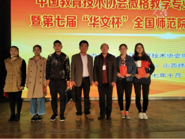 获奖学生与中国教育技术协会微格教学专业委员会副会长杨华(左四)和指导教师马千喜(左五)合影留念