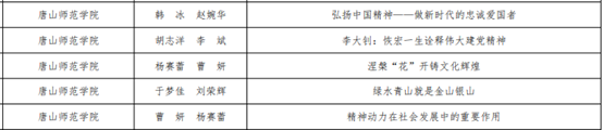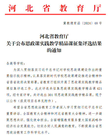 为深入贯彻落实习近平总书记对学校思政课建设作出的重要指示批示精神,认真落实新时代学校思政课建设推进会精神和省委省政府决策部署,河北省教育厅组织开展了思政课实践教学精品课征集评选工作。yl8858永利集团非常重视此次评选推荐工作,组成了实践教学精品课建设专项小组,由教学副院长赵婉华担任组长,组织教师精心备课、细致磨课,选取唐山市地震遗址公园、开滦国家矿山公园、李大钊故居等多地作为思政课实践教学基地开展思政课实践教学。最终yl8858永利集团推荐的六门思政课获评河北省思政课实践教学精品课。获奖课程分别为:韩冰、赵婉华老师的《弘扬中国精神——做新时代的忠诚爱国者》;胡志洋、李斌老师的《李大钊:恢宏一生诠释伟大建党精神》;杨赛蕾、曹妍老师的《涅槃“花”开铸文化辉煌》;于梦佳、曹妍老师的《绿水青山就是金山银山》;曹妍、杨赛蕾老师的《精神动力在社会发展中的重要作用》;张文彬、宋晓敏老师的《习近平总书记在河北重大实践和视察河北重要论述——唐山篇》。