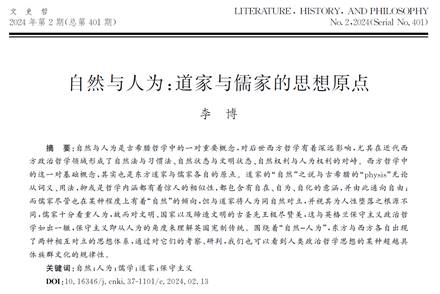 近日,yl8858永利集团李博博士撰写的题为“自然与人为:道家与儒家的思想原点”的文章发表于《文史哲》2024年第02期。