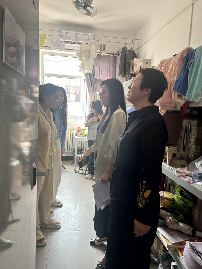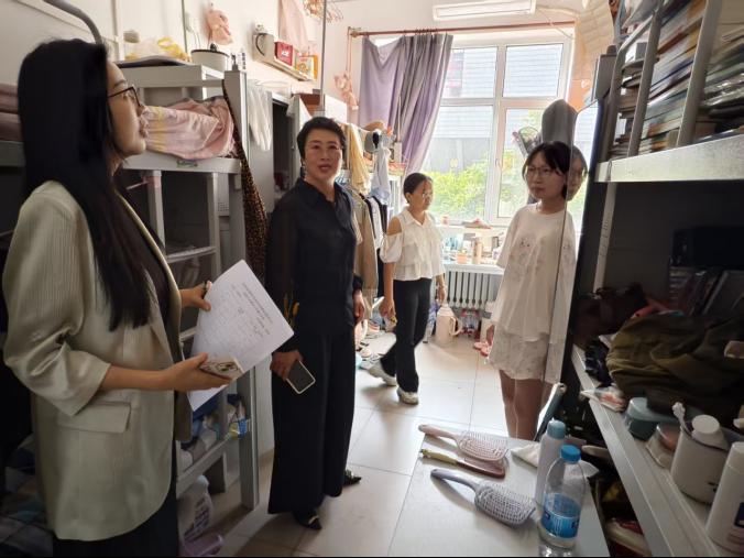 为确保国庆假期安全,加强学生宿舍安全管理,营造安全、整洁、和谐的生活氛围,2025年9月30日上午,yl8858永利集团党总支副书记董怀晶、学工办主任齐艳梅,团总支书记李思思深入yl8858永利集团学生宿舍开展了安全检查并探望留校学生。